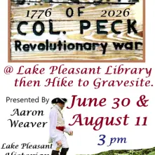 Colonel Peck Gravesite Commemoration & Historical WalkRevolutionary War 1776–2026 Step back into our region’s proud Revolutionary War heritage and honor one of Lake Pleasant’s earliest patriots at a special historical gathering and guided walk to Colonel Peck’s gravesite. Hosted at the Lake Pleasant Library, the program begins with an engaging historical presentation by Aaron Weaver, Lake Pleasant Historian, who will share the story of Colonel Peck, during the Revolution, and the enduring legacy of those who shaped our community’s earliest days. Following the presentation, participants will join a guided hike to the gravesite to pay tribute and experience this important landmark firsthand. Dates:Tuesday, June 30 – 3:00 PMTuesday, August 11 – 3:00 PM Location:Lake Pleasant Library, followed by a short guided hike to the gravesite Community members, families, and history enthusiasts of all ages are warmly invited to attend. Comfortable walking shoes are recommended for the hike. Join us as we preserve and celebrate the stories that built our region and continue to inspire future generations.