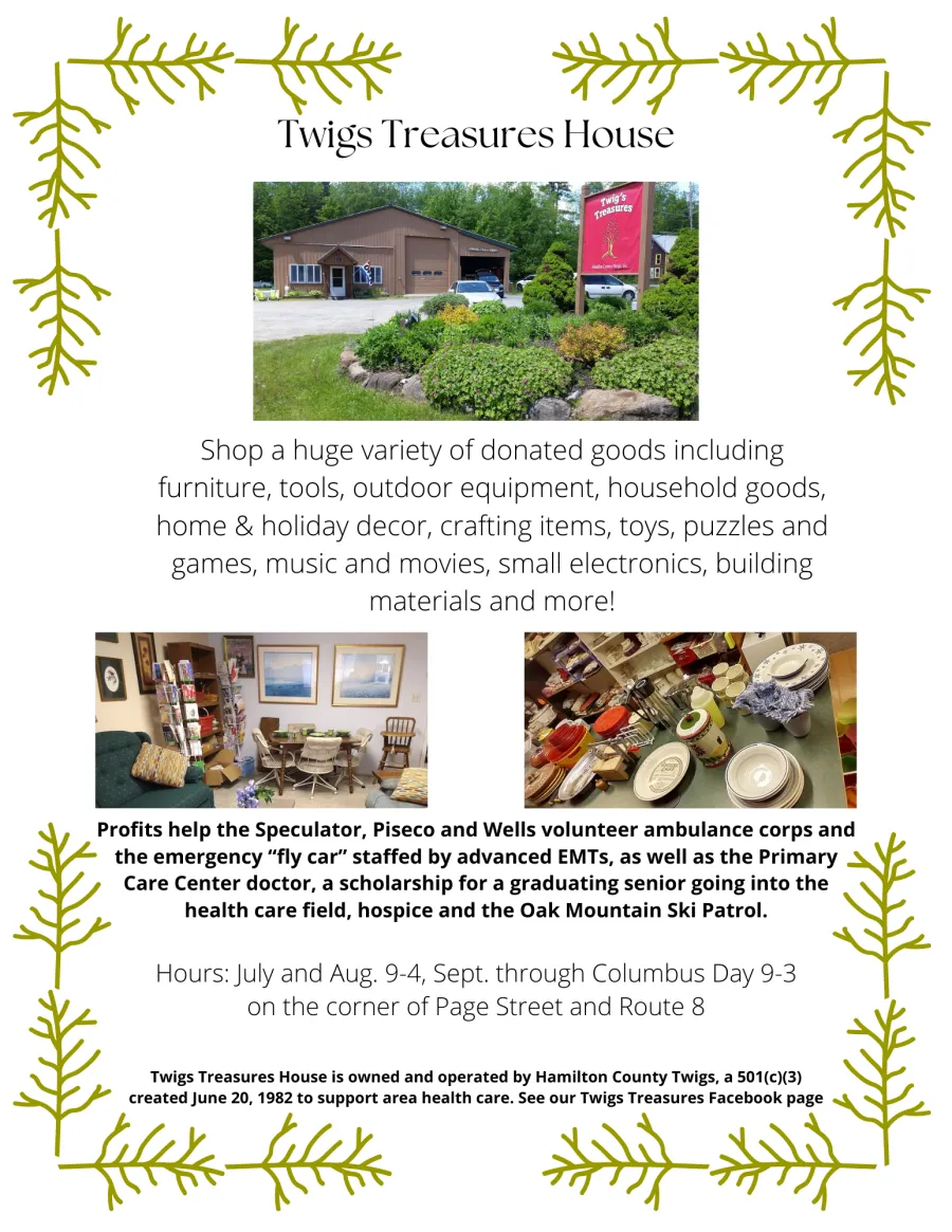 Twigs Treasures is open May 31st-Columbus Day Not-for-profit organization that raises money to support area medical outreach.