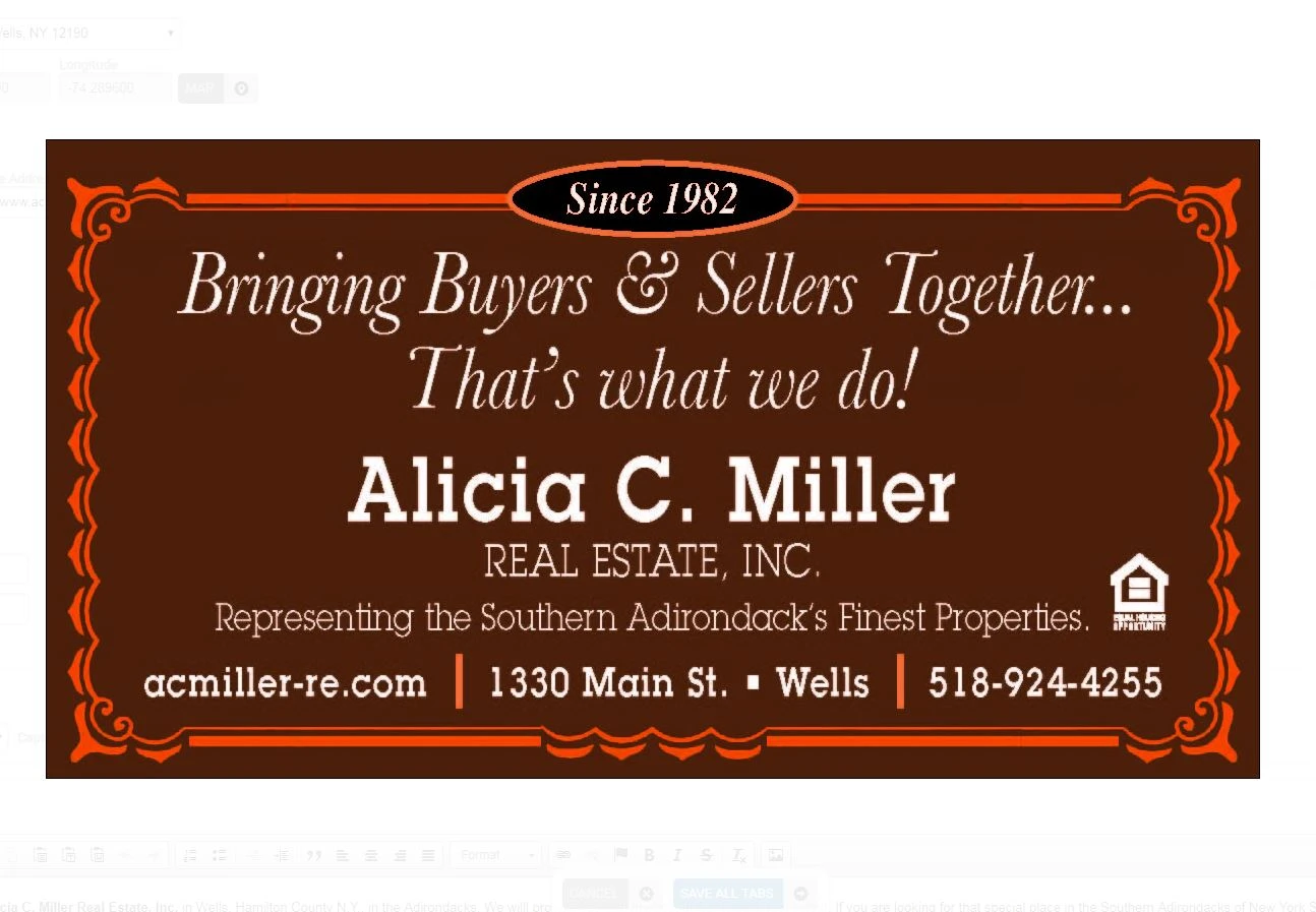 Welcome to Alicia C. Miller Real Estate, Inc. in Wells, Hamilton County N.Y., in the Adirondacks. We willl provide you with the best in Adirondack real estate. If you are looking for that special place in the Southern Adirondacks of New York State, the largest wilderness area in the Eastern United States. we can help you out, Whether it is a new all year modern home, a modest cottage, a simple cabin, empty lot or a local business ready to run, we are a dedicated group of real estate sales agents in the Southern Adirondacks of Hamilton County. We strive to be first in service and are celebrating 34 years in business.