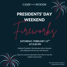 Presidents Day Weekend Fireworks at Camp of the Woods Saturday, February 14th | 8:30 PM Celebrate Presidents' Day weekend with a spectacular fireworks show lighting up the sky over Lake Pleasant! Enjoy the view from Speculator Village Beach or the Point or from the comfort of your own home as the night sky comes alive. CAMP-of-the-WOODS
